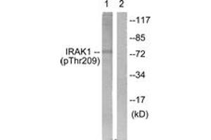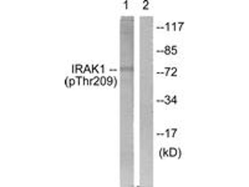IRAK1 (Phospho-Thr209) Antibody detects endogenous levels of IRAK1 only when phosphorylated at Thr209.
