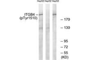 ITGB4 (Phospho-Tyr1510) Antibody detects endogenous levels of ITGB4 only when phosphorylated at Tyr1510.