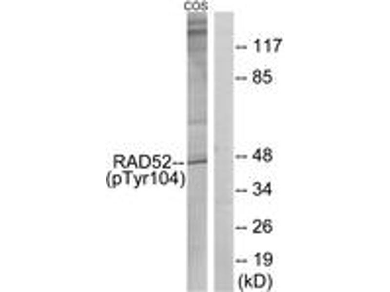 RAD52 (Phospho-Tyr104) Antibody detects endogenous levels of RAD52 only when phosphorylated at Tyr104.