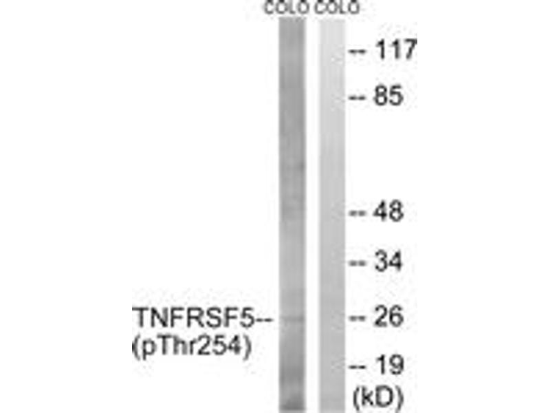 TNFRSF5 (Phospho-Thr254) Antibody detects endogenous levels of TNFRSF5 only when phosphorylated at Thr254.