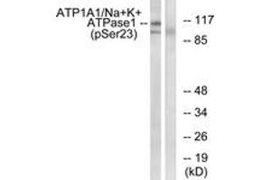ATP1 alpha1/Na+K+ ATPase1 (Phospho-Ser23) Antibody detects endogenous levels of ATP1 alpha1/Na+K+ ATPase1 only when phosphorylated at Ser23.