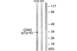 CDK5 (Phospho-Tyr15) Antibody detects endogenous levels of CDK5 only when phosphorylated at Tyr15.