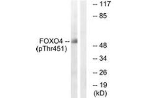 FOXO4 (Phospho-Thr451) Antibody detects endogenous levels of FOXO4 only when phosphorylated at Thr451.
