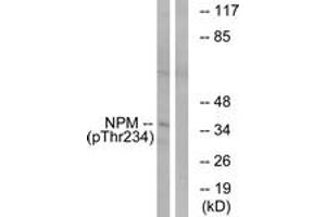 NPM (Phospho-Thr234) Antibody detects endogenous levels of NPM only when phosphorylated at Thr234.