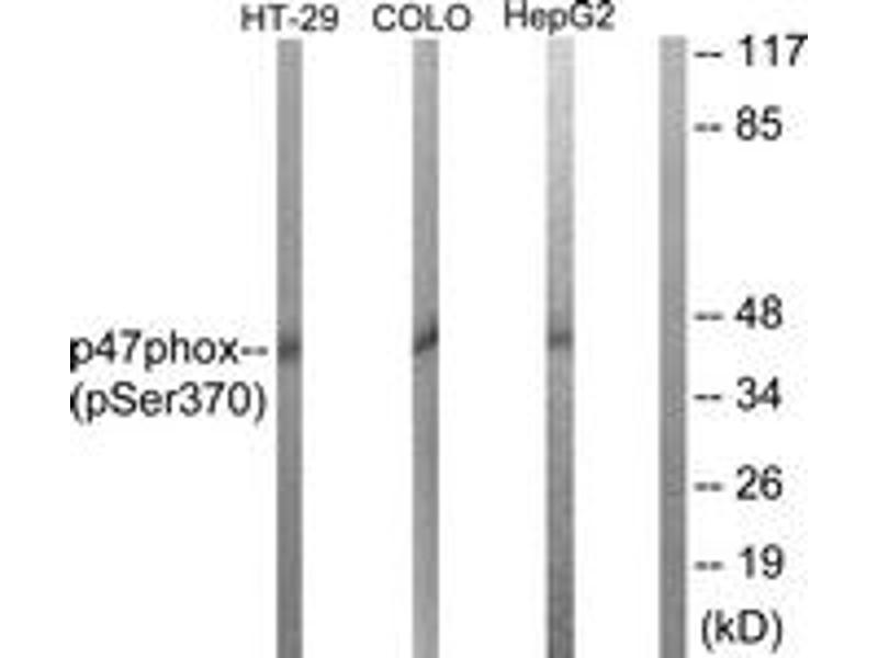 p47 phox (Phospho-Ser370) Antibody detects endogenous levels of p47 phox only when phosphorylated at Ser370.