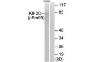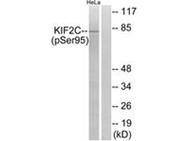 KIF2C (Phospho-Ser95) Antibody detects endogenous levels of KIF2C only when phosphorylated at Ser95.