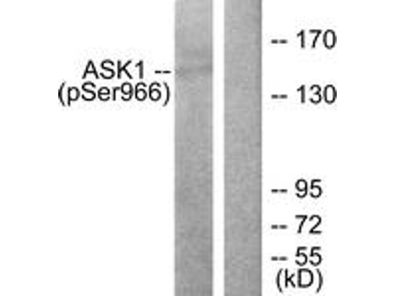 ASK1 (Phospho-Ser966) Antibody detects endogenous levels of ASK1 only when phosphorylated at Ser966.