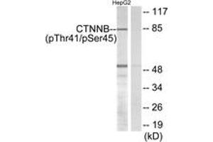 - The antiserum was produced against synthesized peptide derived from human Catenin-beta around the phosphorylation site of Thr41/Ser45.