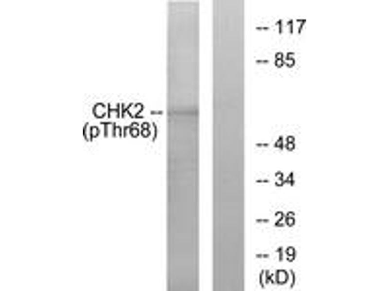 Chk2 (Phospho-Thr68) Antibody detects endogenous levels of Chk2 only when phosphorylated at Thr68.