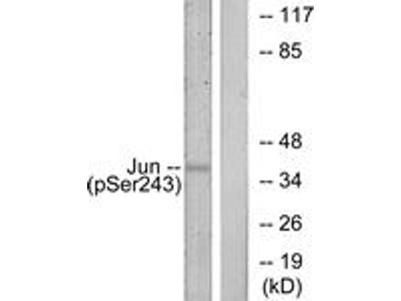c-Jun (Phospho-Ser243) Antibody detects endogenous levels of c-Jun only when phosphorylated at Ser243.