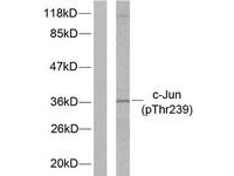c-Jun (Phospho-Thr239) Antibody detects endogenous levels of c-Jun only when phosphorylated at Thr239.