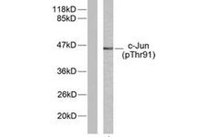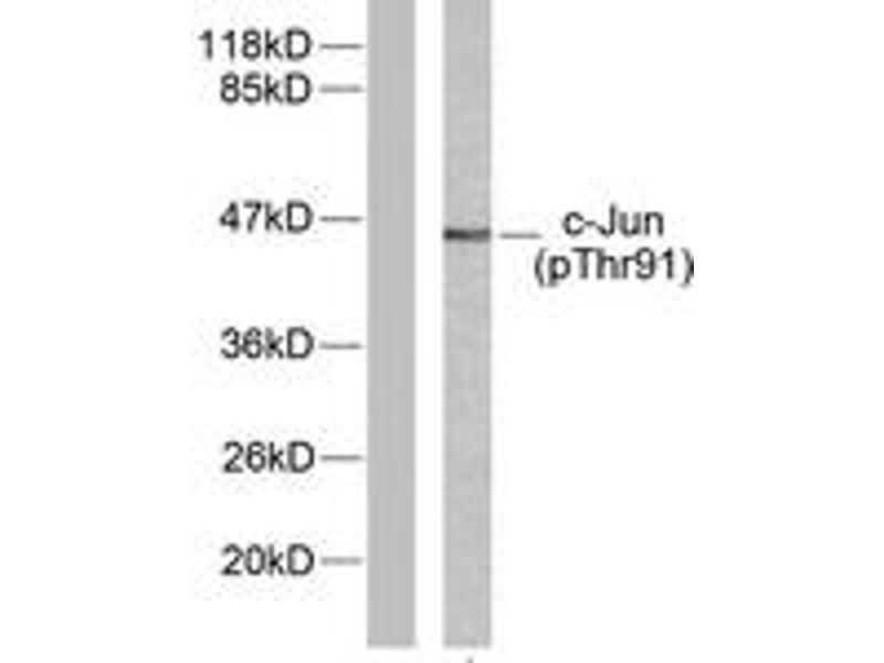 c-Jun (Phospho-Thr91) Antibody detects endogenous levels of c-Jun only when phosphorylated at Thr91.