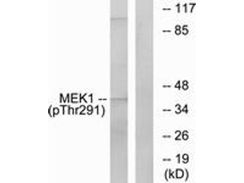 MEK1 (Phospho-Thr291) Antibody detects endogenous levels of MEK1 only when phosphorylated at Thr291.