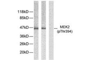 MEK2 (Phospho-Thr394) Antibody detects endogenous levels of MEK2 only when phosphorylated at Thr394.