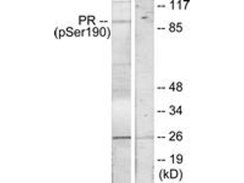 Progesterone Receptor (Phospho-Ser190) Antibody detects endogenous levels of Progesterone Receptor only when phosphorylated at Ser190.