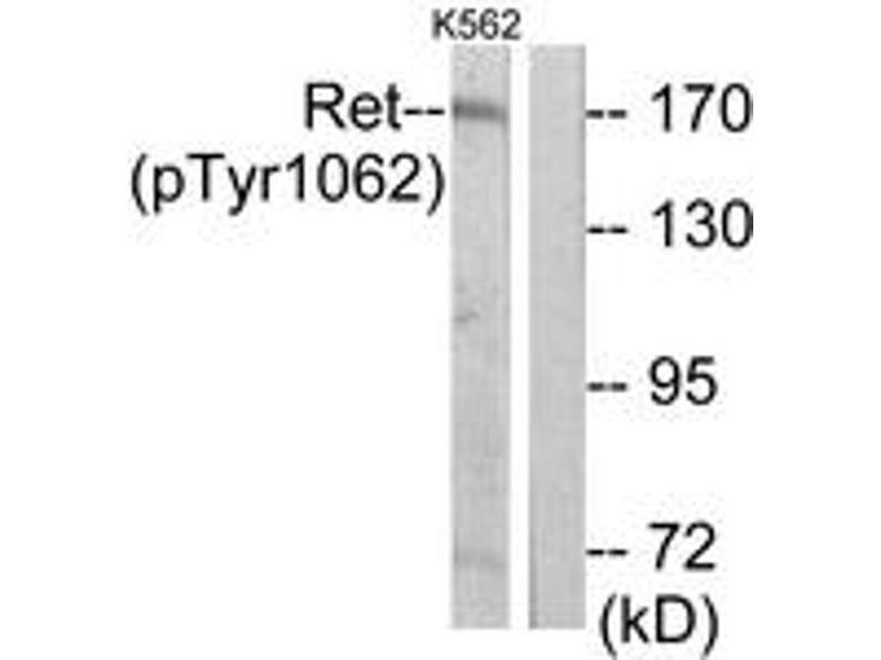 Ret (Phospho-Tyr1062) Antibody detects endogenous levels of Ret only when phosphorylated at Tyr1062.