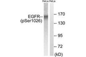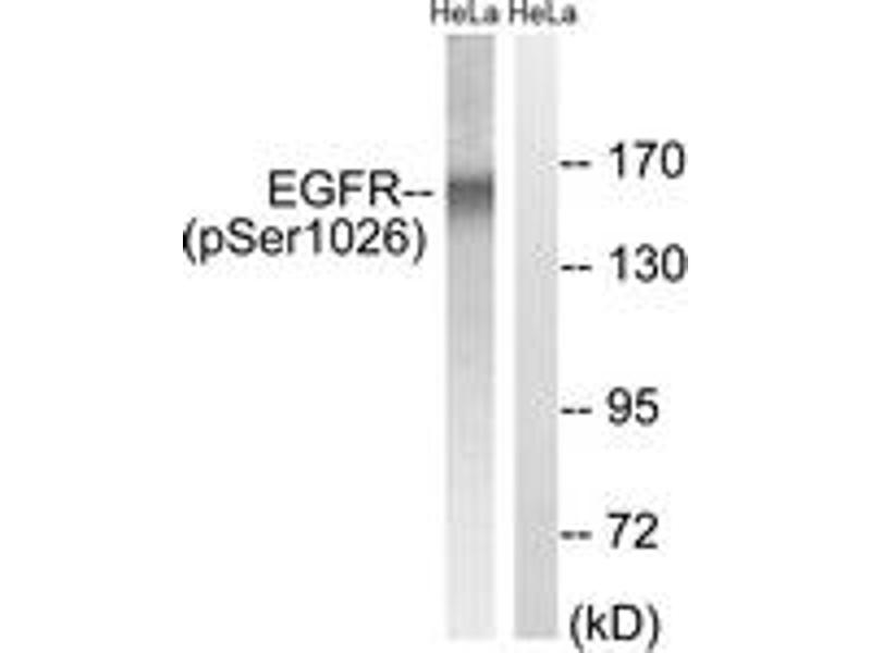 EGFR (Phospho-Ser1026) Antibody detects endogenous levels of EGFR only when phosphorylated at Ser1026.