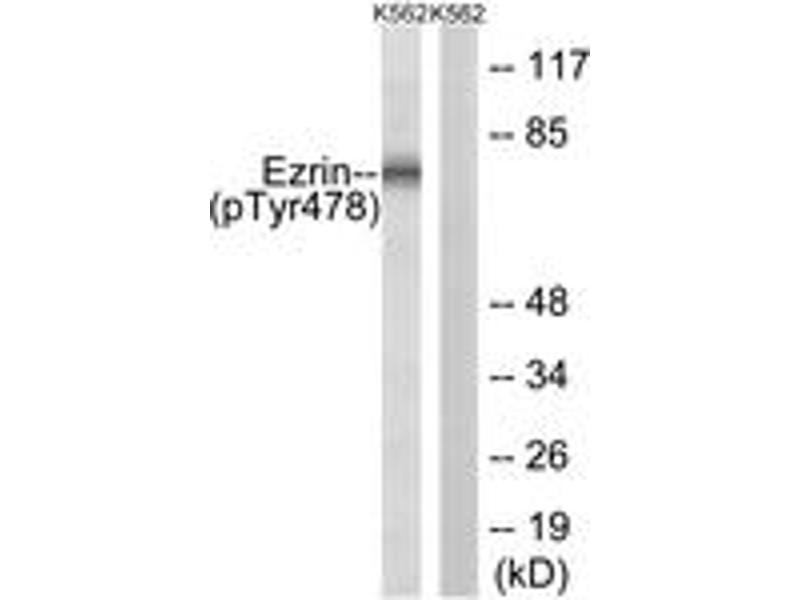 Ezrin (Phospho-Tyr478) Antibody detects endogenous levels of Ezrin only when phosphorylated at Tyr478.