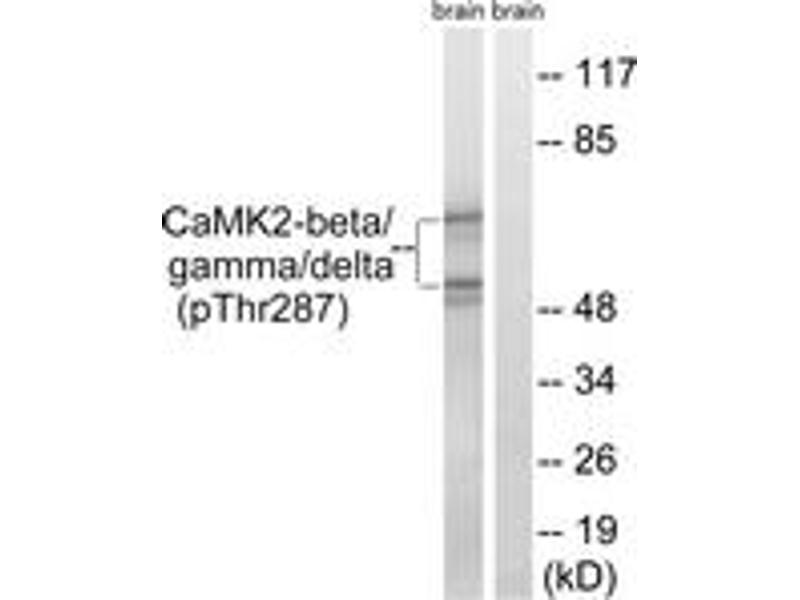 CaMK2-beta/gamma/delta (Phospho-Thr287) Antibody detects endogenous levels of CaMK2-beta/gamma/delta only when phosphorylated at Thr287.