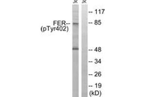 FER (Phospho-Tyr402) Antibody detects endogenous levels of FER only when phosphorylated at Tyr402.