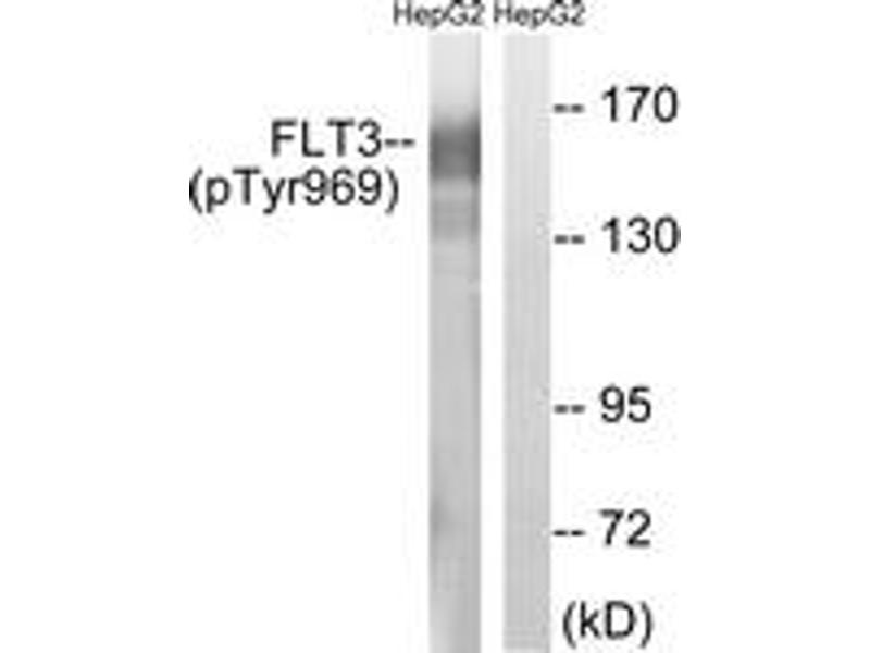 FLT3 (Phospho-Tyr969) Antibody detects endogenous levels of FLT3 only when phosphorylated at Tyr969.