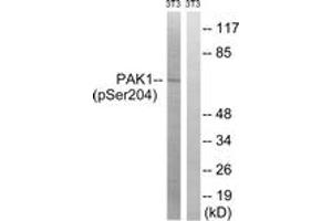 PAK1 (Phospho-Ser204) Antibody detects endogenous levels of PAK1 only when phosphorylated at Ser204.