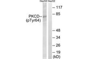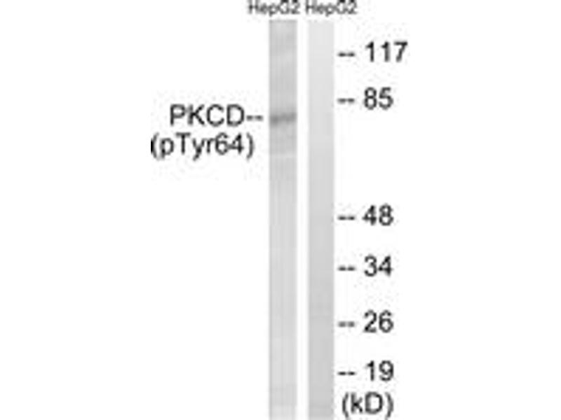 PKCD (Phospho-Tyr64) Antibody detects endogenous levels of PKCD only when phosphorylated at Tyr64.