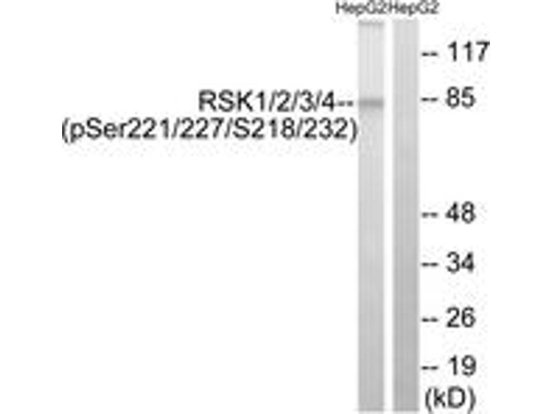 RSK1/2/3/4 (Phospho-Ser221/227/S218/232) Antibody detects endogenous levels of RSK1/2/3/4 only when phosphorylated at Ser221/227/S218/232.