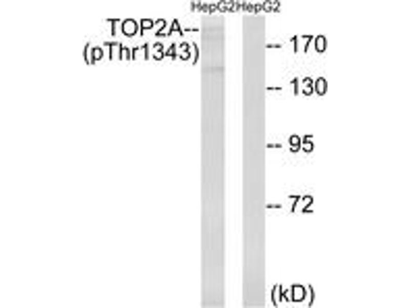 TOP2A (Phospho-Thr1343) Antibody detects endogenous levels of TOP2A only when phosphorylated at Thr1343.