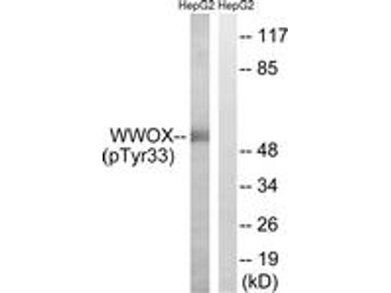 WWOX (Phospho-Tyr33) Antibody detects endogenous levels of WWOX only when phosphorylated at Tyr33.