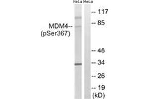 MDM4 (Phospho-Ser367) Antibody detects endogenous levels of MDM4 only when phosphorylated at Ser367.