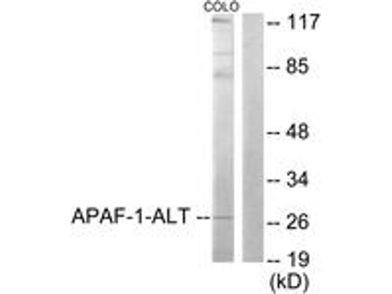 - The antiserum was produced against synthesized peptide derived from human APAF-1-ALT.