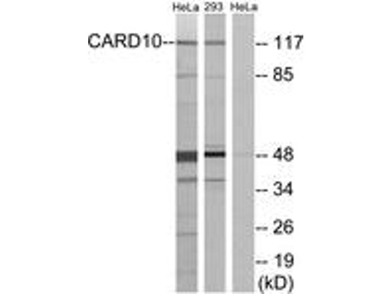 - The antiserum was produced against synthesized peptide derived from human CARD10.