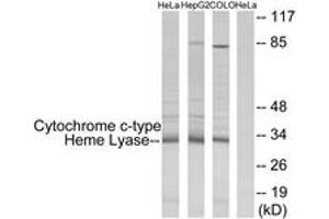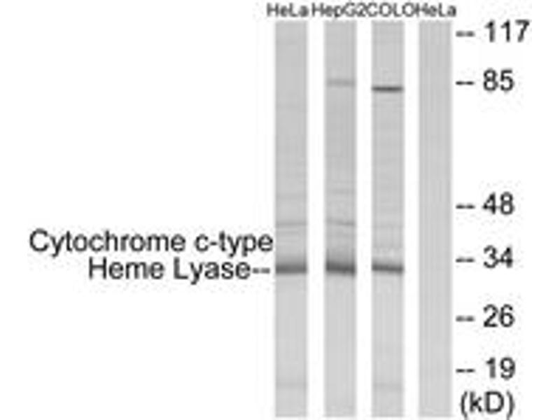 - The antiserum was produced against synthesized peptide derived from human Cytochrome c-type Heme Lyase.