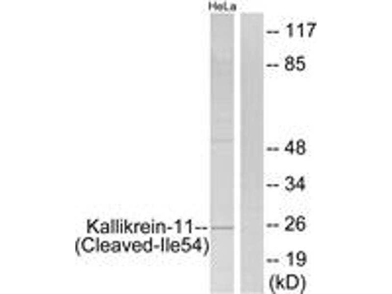 Kallikrein-11 (Cleaved-Ile54) Antibody detects endogenous levels of fragment of activated Kallikrein-11 resulting from cleavage adjacent to Ile54.