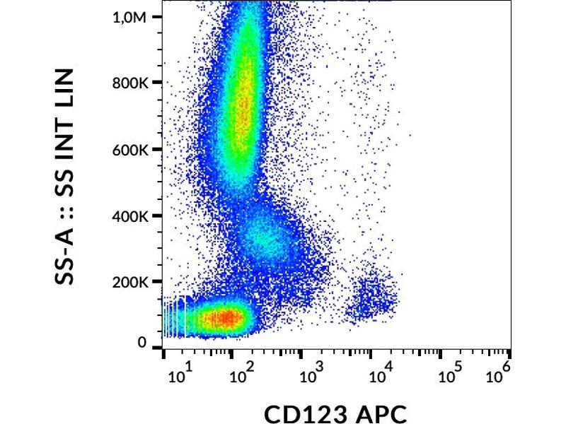 Interleukin 3 receptor subunit alpha,CD123 is the alpha chain of interleukin 3 receptor (IL-3R alpha). This subunit heterodimerizes with the interleukin 3 receptor beta chain (CD131), which is shared with other receptors. CD123 interacts with IL-3 specifically, but with low affinity, and association with the beta subunit confers high affinity binding to the receptor heterodimer. Both chains are required for signaling, but receptor activation and signal transduction depend on IL-3 binding to CD123 as the initial step.,IL3RA, MGC34174, hIL-3Ra