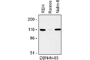 The mouse monoclonal antibody DBN-N-03 recognizes drebrin, an approximately 100-125 kDa intracellular regulator of actin cytoskeleton.