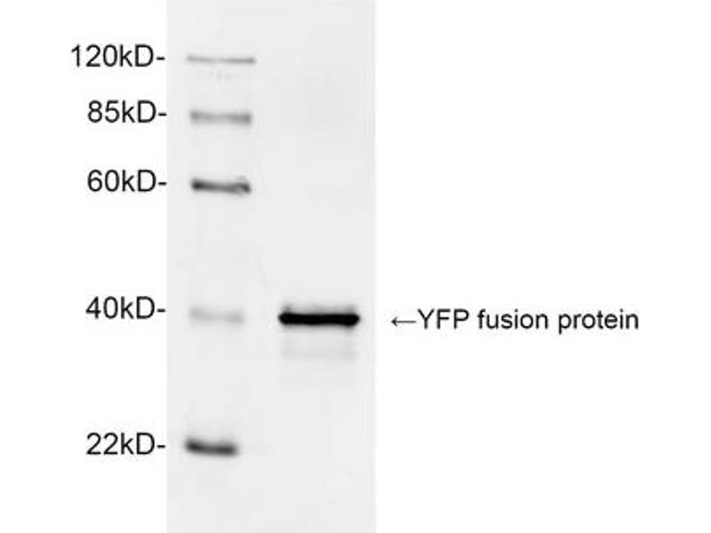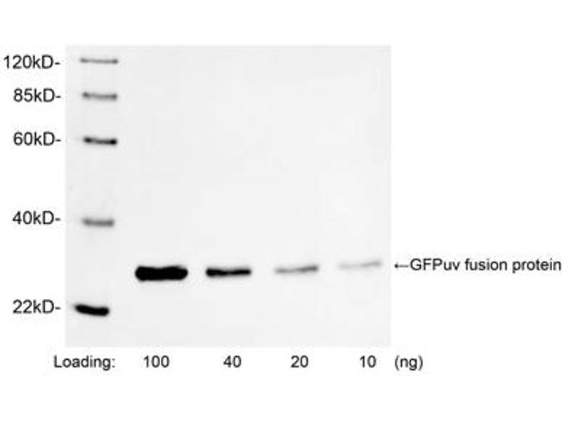 Rabbit Anti-GFP Polyclonal Antibody reacts with GFP fusion proteins. The antibody also reacts with other variants of GFP, such as CFP, YFP, eGFP and GFPuv.