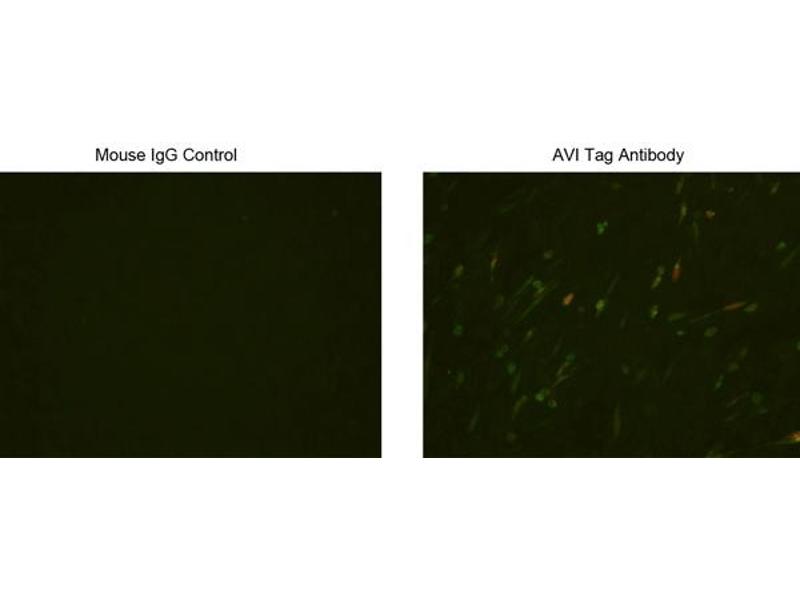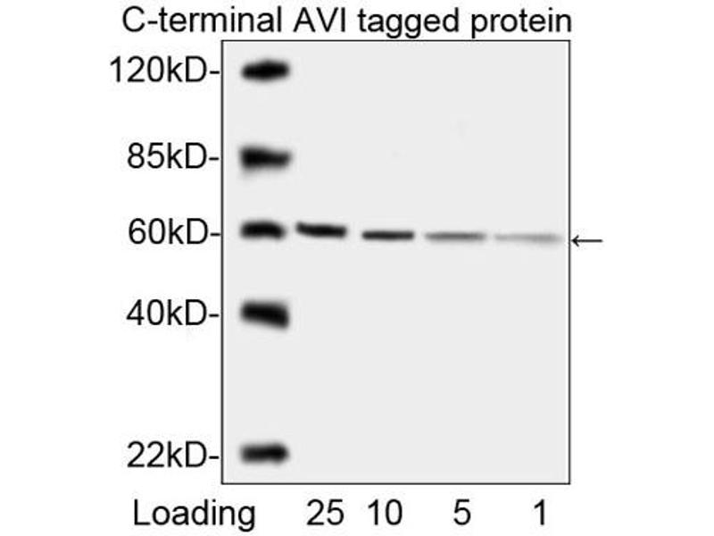 Avi Tag Antibody, mAb, Mouse recognizes C-terminal Avi tagged fusion proteins and slightly recognizes N-terminal Avi tagged fusion proteins in Western Blot.