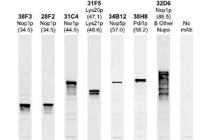Nop1p was originally identified as a nucleolar protein of bakers yeast, Saccharomyces cerevisiae (accession P15646). The Nop1p protein is 327 amino acids in size, is essential for yeast viability, and is localized in the nucleoli. The systematic name for S. cerevisiae Nop1 is YDL014W, and it is now known to be part of the small subunit processome complex, involved in the processing of pre-18S ribosomal RNA.Nop1p is the yeast homologue of a protein apparently found in all eukaryotes and archea generally called fibrillarin. Fibrillarin/Nop1p is extraordinarily conserved, so that the yeast and human proteins are 67% identical, and the human protein can functionally replace the yeast protein. This means that suitably cross-reactive antibodies to Nop1p/fibrillarin, like MCA-38F3, can be used to reveal nucleoli and study fibrillarin/Nop1p in all eukaryotes and archea tested to date. Human fibrillarin has been characterized (accession P22087) and the human fibrillarin gene is located on chromosome 19. Fibrillarin/Nop1p proteins have been cloned and sequenced from several other species (e.g. Mouse, accession P35550, Xenopus accession P22232, C. elegans accession Q22053, and S. pombe accession P35551. The N terminal approx. 80 amino acids contain multiple copies based on the peptide RGG, or arginine-glycine-glycine, sometimes referred to as GAR repeats, characteristic of the GAR family of molecules. The remaining approx. 240 amino acids consist of the so called fibrillarin domain. A fibrillarin homologue has also been identified in the genome of the archean Methanococcus (accession NC_000909). This protein lacks the RGG rich N-terminal extension but is clearly homologous to the other sequences throughout all of the fibrillarin domain. The 3D structure of this molecule has been determined and shown to consist of 2 extended beta,-sheets flanked by alpha,-helixes (Medline link). Patients with the autoimmune disease scleroderma often have strong circulating autoantibodies to a approx. 34 kDa protein which was subsequently found to be fibrillarin. Recent studies show that knock out of the fibrillarin gene in mice results in embryonic lethality, although mice with only one functional fibrillarin/Nop1p gene were viable. This antibody is becoming widely used as a convenient marker for nucleoli in a wide variety of species (e.g. 4-6). The HGNC name for this protein is FBL.