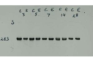 For immunofluorescence try dilutions of 1:500, for immunohistochemistry with ABC or other enzymatic amplification procedures try 1:5,000. For western blots try 1:10,000 dilutions. On Western blots the antibody is unusually strong and specific in bindingas shown above. The antibody is clean and specific on immunoblots. Can be used on formalin-fixed cells in tissue culture, cryostat sections, and Western blotting. The epitope recognized by the 2E3 clone is in the C-terminal non-helical extension of the protein and is unusually resistant to aldehyde fixation, so that this antibody is ideal for studies of paraffin embedded formalin fixed histological sections.