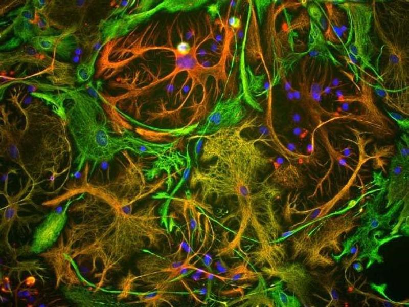 - Vimentin is a protein subunit of 10 nm or intermediate filaments, which are major components of the cytoskeleton in most cell types. Vimentin is the major intemediate filament subunit found in mesenchymal cells, and was first named and characterized in a collaborative study from the labs of German scientists Werner Franke and Klaus Weber. The name derives from the Latin Vimentum, meaning arrays of flexible rods such as in lattices, filigrees and wicker-work, which describes the intermediate filament network quite well. Vimentin is also found in many cell types in tissue culture, most notably fibroblasts, and in developing neuronal and astrocytic precursor cells in the central nervous system. Many cell lines such as Hek293, HeLa, 3T3 and Cos cells contain prominent vimentin networks. Vimentin frequently forms copolymers with other intermediate filament proteins, such as GFAP (in astrocytes, ependymal cells and neural stem cells), with desmin (in muscle and endothelial cells) and neurofilament proteins (in developing neurons). A E151K point mutation in the vimentin gene was shown to be causative of an autosomal dominant pulverulent cataract disease, but so far only in a single patient. Vimentin is a major protein of eye lens and cornea, and this mutation renders the molecule unable assemble into normal 10 nm filaments. Antibodies to vimentin are useful in studies of stem cells and generally to reveal the filamentous cytoskeleton. The immunogen used to generate our antibody was recombinant human vimentin expressed in and purified from E. coli. The same immunogen was used to produce our other monoclonal antibody to vimentin MCA-2D1. We also market a very popular chicken polyclonal antibody to vimentin, CPCA-Vim. The HGNC name for this protein is VIM.