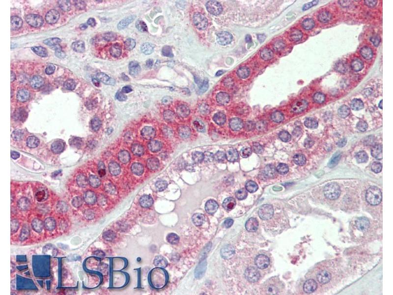 Immunohistochemistry: Paraffin embedded Human Kidney. Recommended concentration: 5 μg/mL.