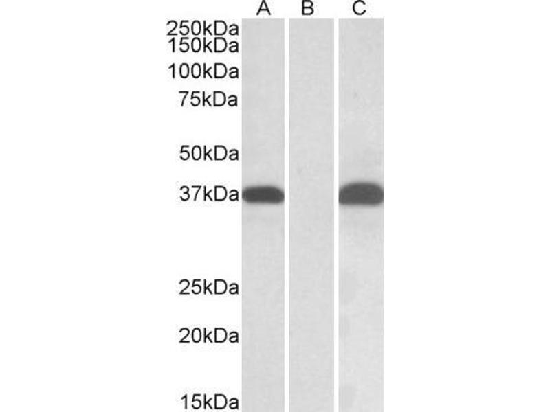 Western Blot: In transfected HEK293 transiently expressing Human PIM2 (myc and DYKDDDDK tagged), a band of approx. 38 kDa is observed. No bands are observed in mock-transfected HEK293 and the same band is observed using anti-myc antibody. Recommended con