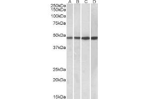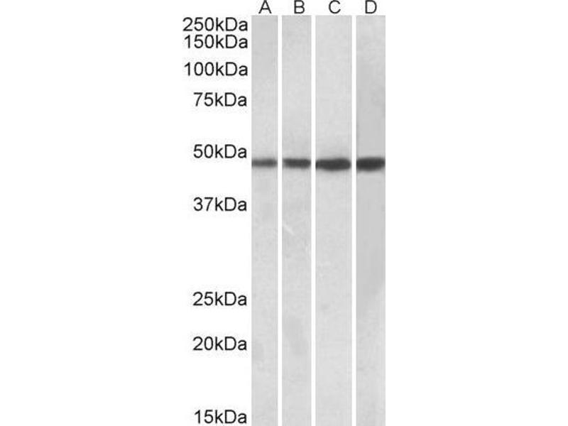 Western Blot: Approx 48 kDa band observed in Human Tonsil and Spleen and Mouse Spleen lysates and also in lysates of cell line Daudi (calculated MW of 48.2 kDa according to NP_078879.2). Recommended concentration: 0.3-1 μg/mL.