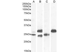 Western Blot: Approx 25+26 kDa doublet band observed in Human Heart, approx 24+27 kDa in Mouse Heart, approx 25 kDa in Rat Heart and approx 27 kDa in Pig Heart lysates (calculated MW of 24 kDa according to Human NP_000354.4, and Pig NP_001092069.1 and 24.3 kDa
