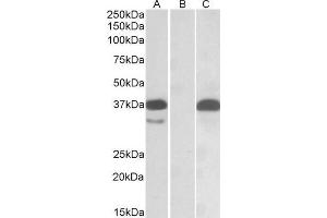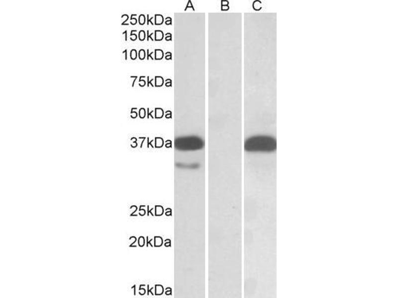 Western Blot: In transfected HEK293 transiently expressing Human PIM2 (myc and DYKDDDDK tagged), a band of approx. 38 kDa is observed. No bands are observed in mock-transfected HEK293 and the same band is observed using anti-myc antibody. Recommended con