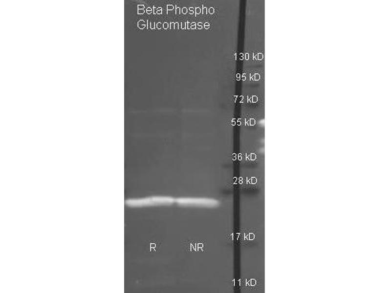 Application Note: Anti-Beta-Phosphoglucomutase Biotin has been tested by ELISA and western blot. This product is assayed against 1.0 μg of Beta-Phosphoglucomutase in a standard capture ELISA using Peroxidase Conjugated Streptavidin #S000-03 and ABTS (2,2'-azino-bis-[3-ethylbenthiazoline-6-sulfonic acid]) code # ABTS-100 as a substrate for 30 minutes at room temperature. A working dilution of 1:10,000 to 1:50,000 is suggested for this product.