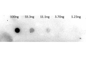 Application Note: Anti-Trypsinogen Biotin Conjugated antibody has been tested by dot blot and is suitable to be assayed against 1.0 μg of Trypsinogen in a standard capture ELISA using Peroxidase Conjugated Streptavidin #S000-03 and ABTS (2,2'-azino-bis-[3-ethylbenthiazoline-6-sulfonic acid]) code # ABTS-100 as a substrate for 30 minutes at room temperature. A working dilution of 1:4,000 to 1:20,000 of the reconstitution concentration is suggested for this product.