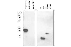 The antibody has been tested by ELISA and Western blot analysis to assure specificity and reactivity. Since application varies, however, each investigation should be titrated by the reagent to obtain optimal results. Recommended dilution range for Western blot analysis is 1:500 ~ 1:2,000. This antibody (5C2) has the specificity against the NAC domain (61-95aa) of alpha-synuclein. Recommended starting dilution is 1:1,000.